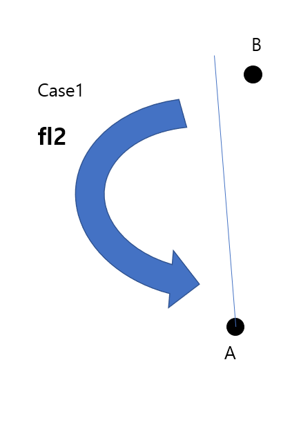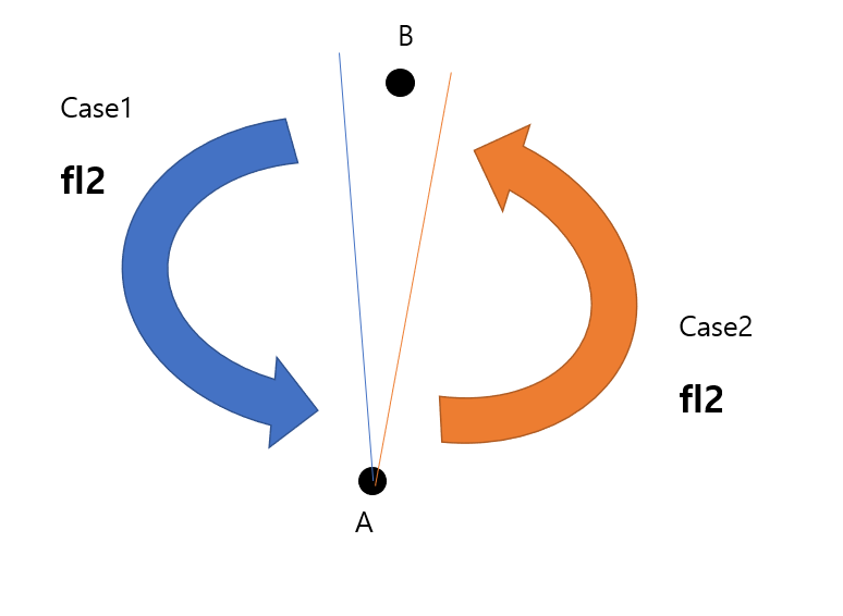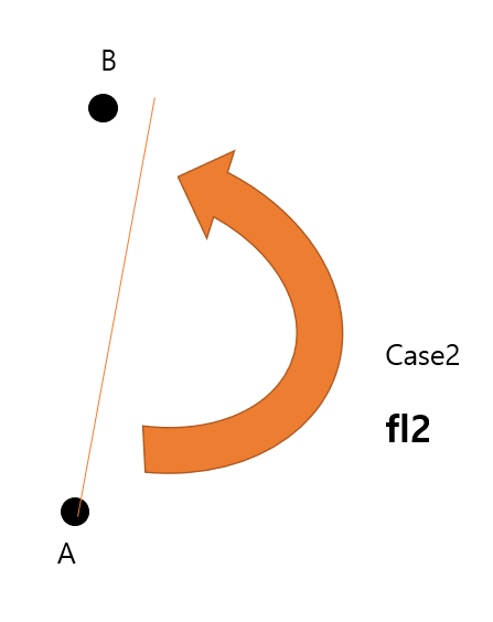 C가 현재 i의 역할을 하고 있으며 fl2가 B에서 D로 넘어가게 되는 것이다. fl2가 B에서 D로 넘어갔다는 것은 반직선 C->C'과 반직선 B->D가 이루는 CCW가 양수(반시계 방향)라는 것이고 위의 그림은 틀렸다.