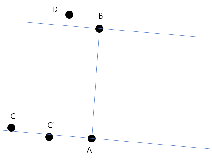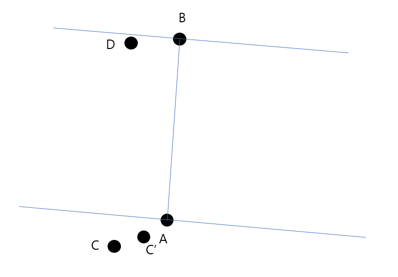 다음과 같은 그림이 좀 더 정확하며 이와 같은 위치 관계가 나오게 될 것이다. 그런데 위에서 언급한 모든 점들은 볼록 껍질을 이루고 있기 때문에 기울기 관계에 의해서 (C->C', B->D)의 CCW 값이 양수이면 (C->A, B->D)의 CCW 값이 양수가 된다.