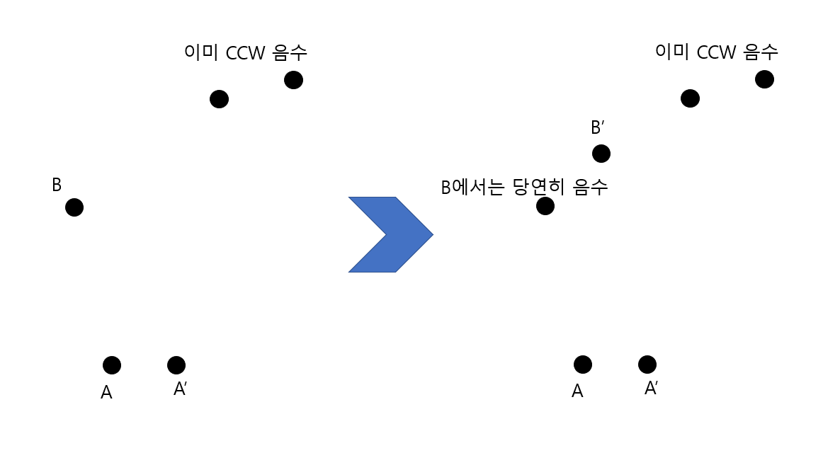 이번에는 A의 다음점 A'과 B의 전 점 B'을 잡아보자. fl2가 B까지 도달하지 못했다는 것은 그 이전에 CCW값이 음수가 되었다는 것이다. 이번에도 잘 생각해보면 볼록 껍질이기 때문에 위와 같이 이전에 음수가 되었으면 (A->A', B'->B)의 CCW값은 당연히 음수가 된다.