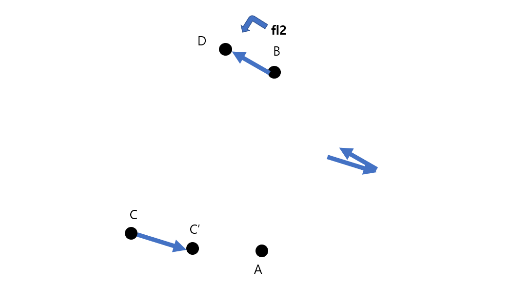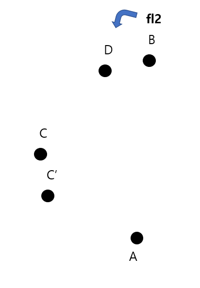 Case 1을 살펴보자. A에 가기 이전에 이미 fl2가 B를 지나쳤다는 것은 A와 B사이에 어떠한 점 C가 존재해서 B에서 다음점으로 fl2를 넘겼다는 것이다. B의 다음 점을 D라고 해보자. 또한 C의 다음 점을 C'이라고 할 것이다. 그러면 아래와 같은 그림이 나오게 된다.