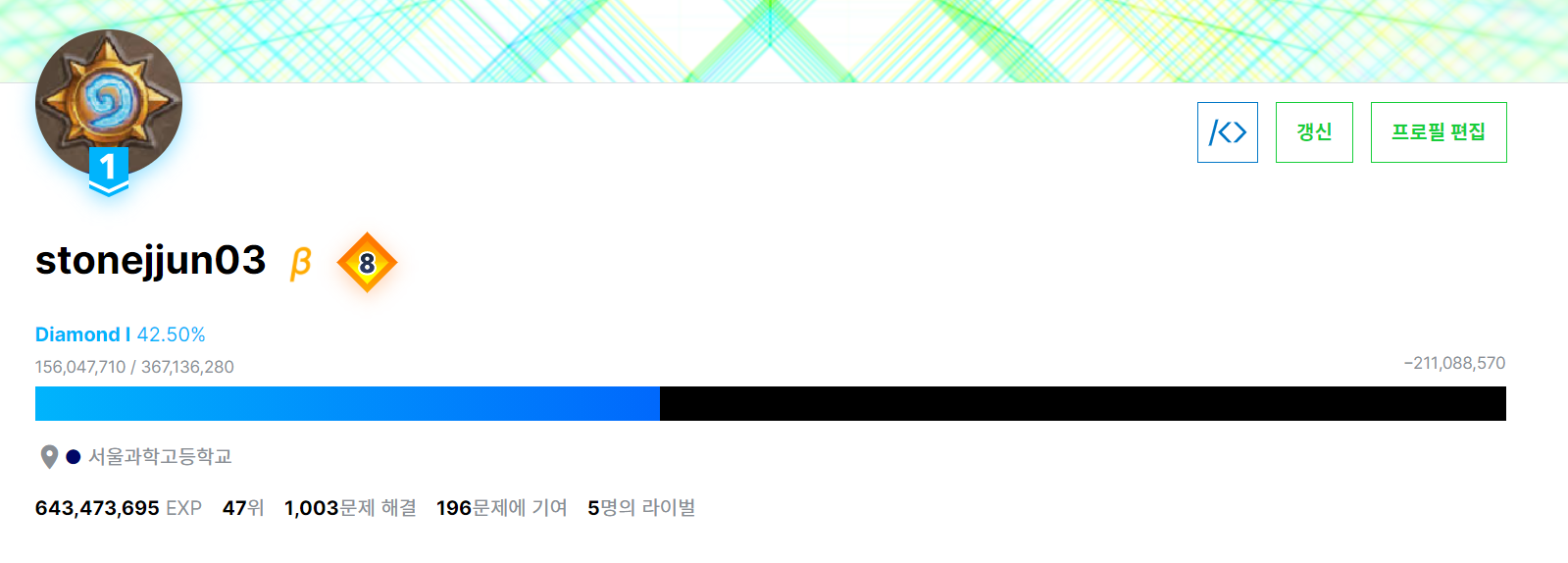 1000문제 달성!!!! 요즘 정말 꾸준히, 열심히 풀었다. 그 결과 1000문제를 달성할 수 있었다. 또한 KOI 전체 문제집을 만들어서 3문제를 뺀 모든 문제를 풀었다.
