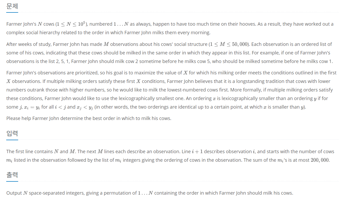 첫 줄에 n과 m이 주어진다. n는 소의 숫자이며, m은 세트의 숫자이다. 다음 m개의 줄에 한 세트씩 입력이 들어온다. 한개의 세트에 대한 입력은 k와 k개의 숫자로 구성된다. k개의 숫자는 소들의 순서관계이다. 우리는 위에서부터 최대한 많이 순서를 지켜서 소들을 정렬 시키려고 한다. 순서가 상관없는 소들에 대해서는 숫자가 작은 소를 우선으로 정렬한다. 이때 위에서 부터 지킬 수 있는 조건의 갯수와 그 정렬방법을 출력해야 한다.