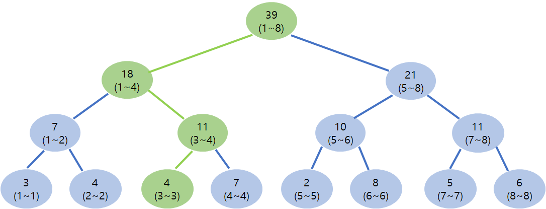 1~7의 구간은 1~4 + 5~6 + 7~7로 표현 할 수 있다. 그래서 그림에서 이렇게 세 노드의 합을 구하면 알아낼 수 있다.