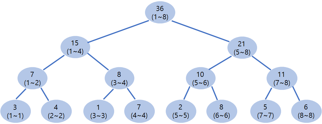 구간의 합을 저장하고 있는 트리이다. 1번 값은 1~2번 값의 합에 포함되어 있으며, 1~4번 값의 합에 포함 되어있다.