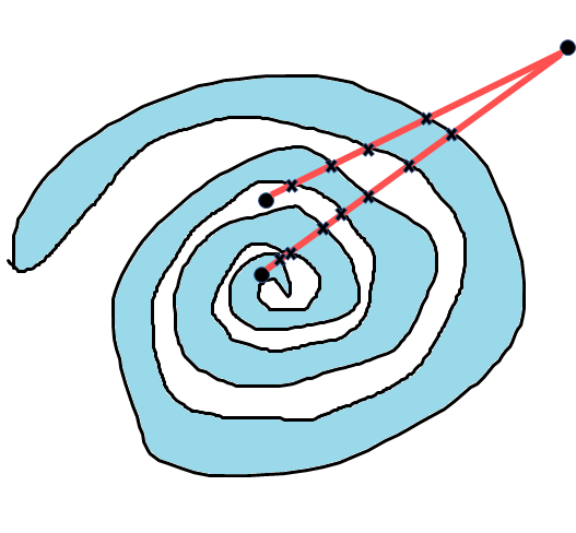 위의 그림에서 확인하고 싶은 점에 대해서 먼 점을 찍으면 그 둘을 이은 선분이 도형을 한 번 지나칠때 마다 내부와 외부가 바뀐다는 사실을 알 수 있다. 따라서 전 글에 나와있는 선분 교차 알고리즘을 이용하면 쉽게 문제를 해결할 수 있다.
