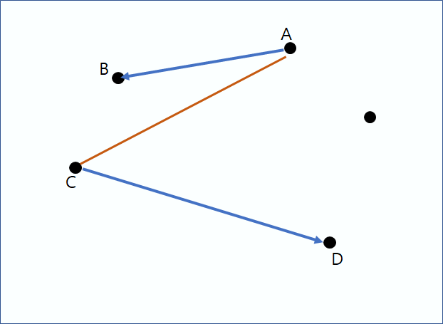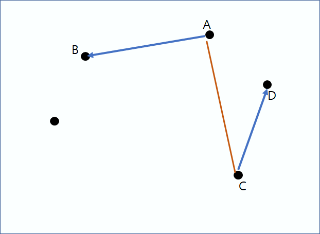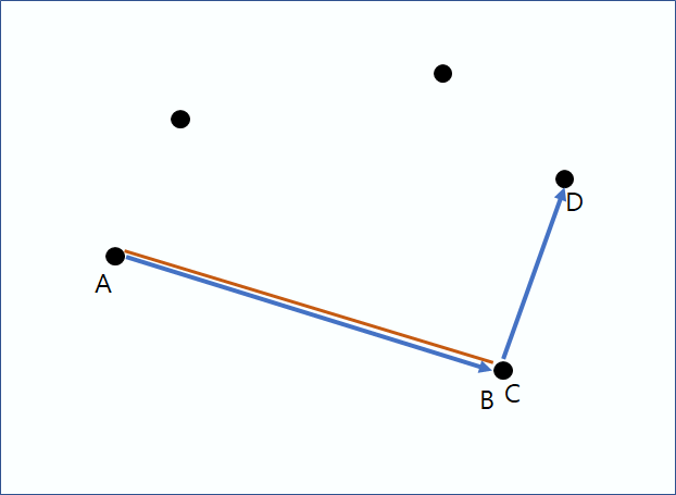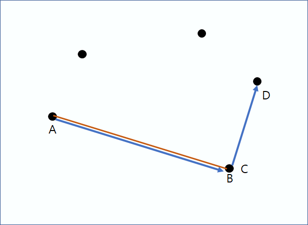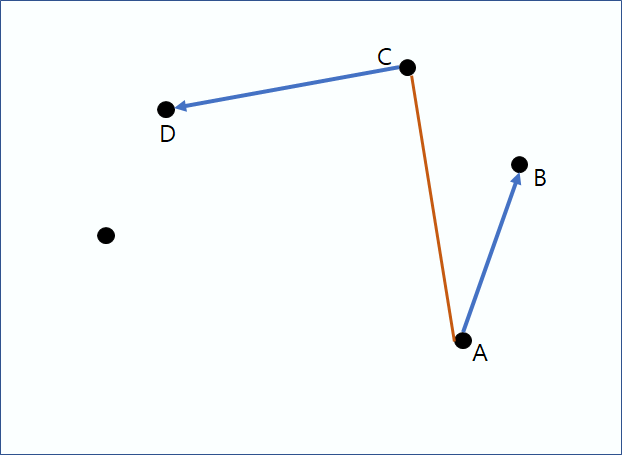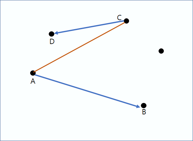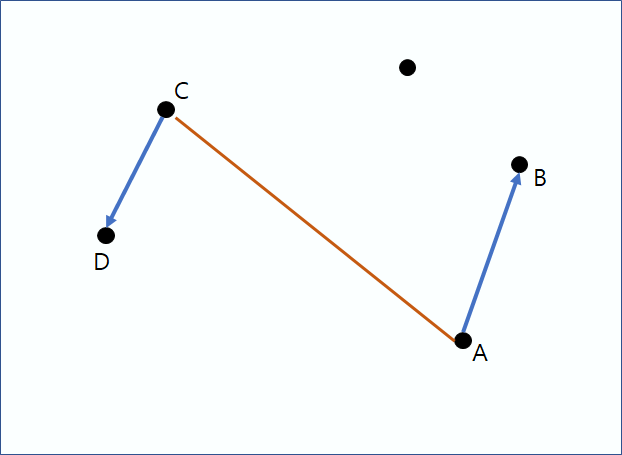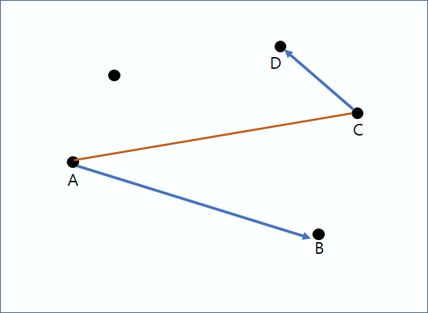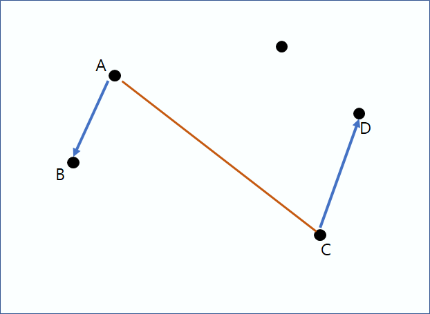 4. 벡터 AB와 벡터 CD의 CCW를 이용해 두 벡터가 정반대에 가까워지도록 A를 한칸 돌리거나 C를 한칸 돌린다.