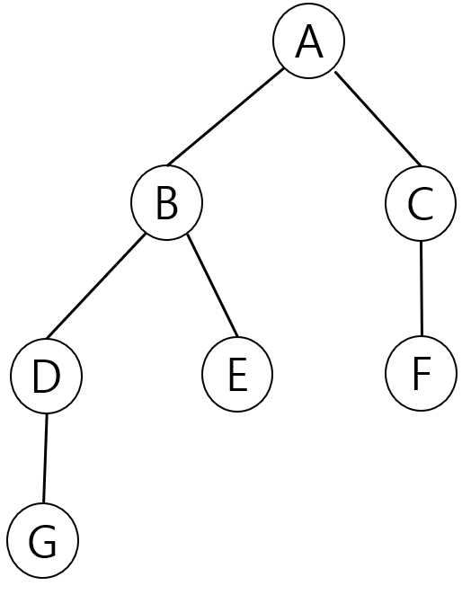 A에서 시작을 하게 되면 A와 연결된 B와 C를 다음으로 탐색을 하게 된다. 그 다음은 B에서 시작하여 이미 방문을 한 A를 제외하고 D, E를 탐색하고, C를 기준으로 방문한 A를 제외하고 F를 탐색한다. 그리고 D를 기준으로 G 를 탐색하고, EFG 기준으로 탐색하려고 하지만 할것이 없어 종료된다. 전체적인 순서를 나열하면 A->B->C->D->E->F->G.